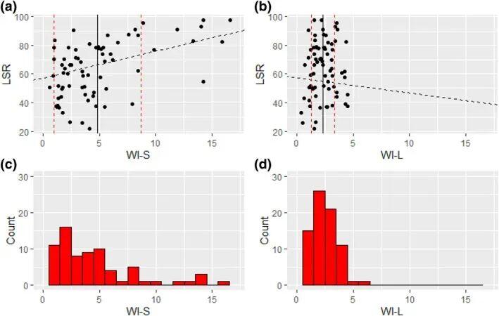 參考資料 [3]:仰臥位覺醒指數 (WI-S) 和側臥位覺醒指數 (WI-L) 與側臥位比率 (LSR) 的關係存在差異,大多數參與者的 WI-L 或 WI-S 值在每小時 1.5-2.5 次覺醒之間;然而,WI-S 的分佈更廣,標準差更大