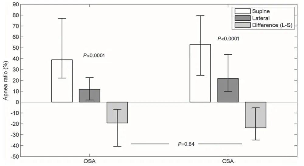 參考資料 [4]:以阻塞性睡眠呼吸暫停(OSA)和以中樞性睡眠呼吸暫停(CSA)爲主的患者在仰臥位(空心柱)和側臥位(深色柱)時的呼吸暫停比率(AR)。淺色柱代表側臥位與仰臥位之間的差異。