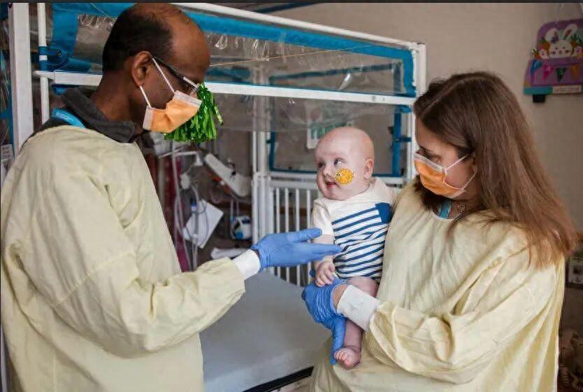 接受基因編輯治療的嬰兒與研究團隊成員。圖片來源:費城兒童醫院