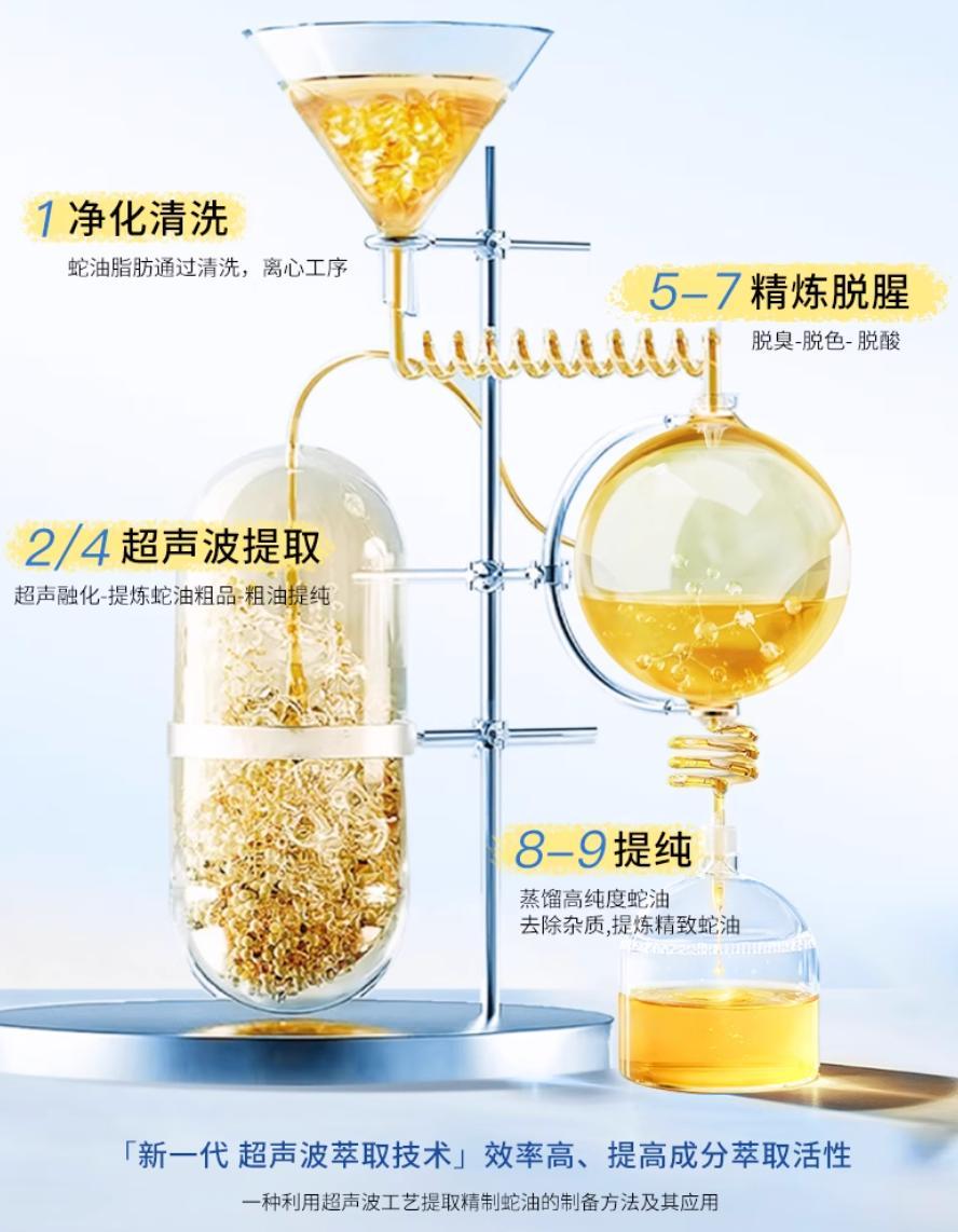 如今,金蛇品牌在恪守傳統蛇油古法萃取技藝的同時,更融合前沿科技“新一代超聲波萃取技術”精進品質,分子小更好吸收。
