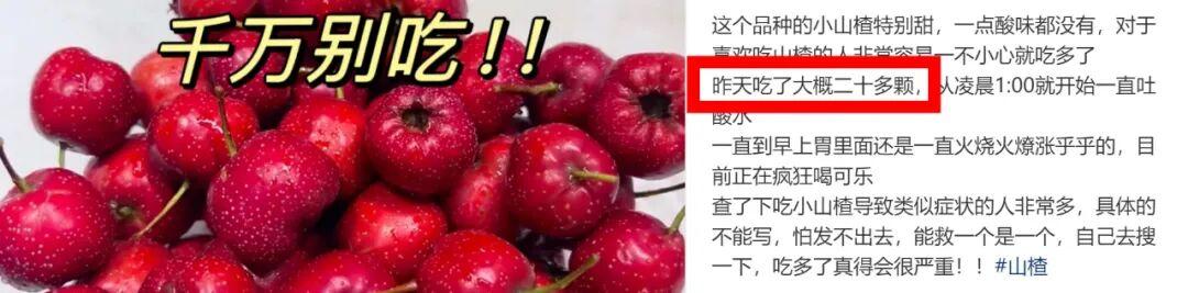 小紅書上說自己喫山楂出現胃部不適的,大部分都是因爲喫得有點多——“喫了大概20多顆”、“喫了不止40個”、“飯前大約喫了30個小山楂”、“一份全喫完了”……有些腸胃敏感的,甚至喫幾顆就會中招。