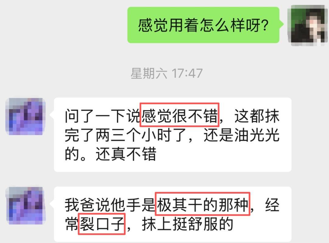 @同事爸爸:手部常年乾燥和開裂,每天早晚用它當護手霜塗滿全手,不僅能撫平裂口、對付老繭和倒刺,還能充分滋養皮膚。