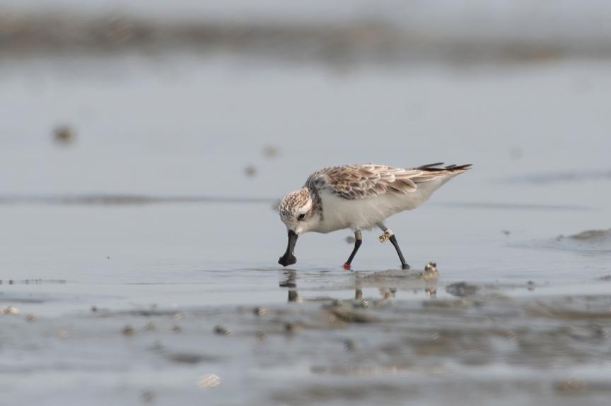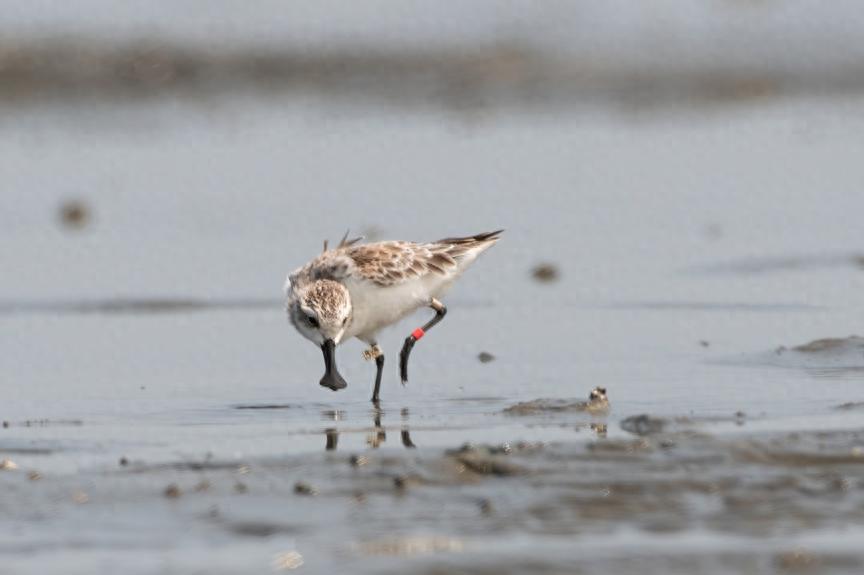 勺嘴鷸5X,白色的足旗(左)說明它是“偷蛋計劃”中出生的幼鳥,5X爲個體編號。2020年4月12日湛江雷州灣記錄 | 小鴿