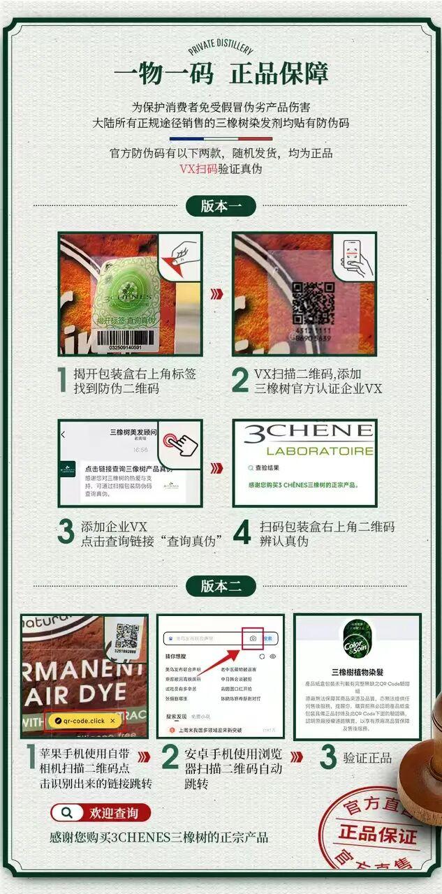 目前防僞碼已升級,市面上會存在四款【三橡樹防僞碼】,大家可通過以下方式掃碼查詢