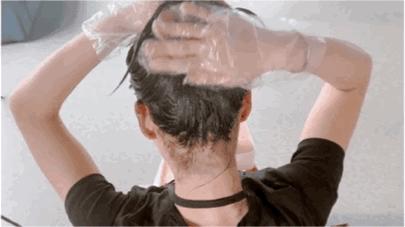 4.塗抹完,可以用保鮮膜、浴帽包裹頭髮,耐心等待40-60分鐘,顏色就均勻上頭了。期間也可以用吹風機加熱一下幫助頭髮上色~