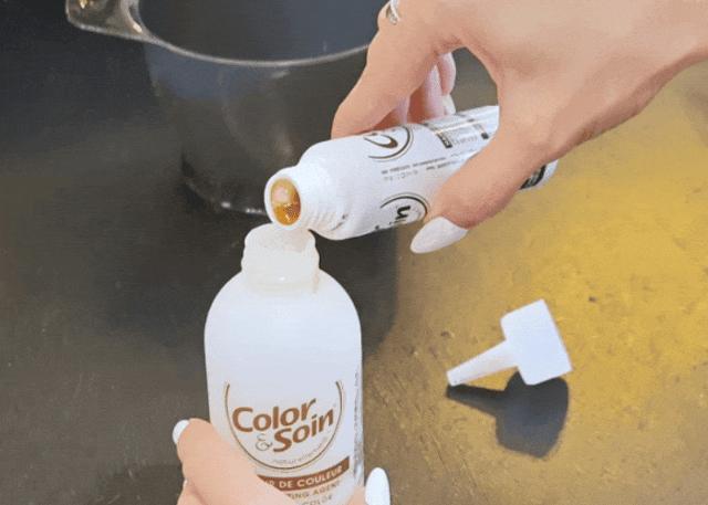 1.先把瘦瓶的染髮劑倒進胖瓶的固色劑裏,蓋上蓋子(※千萬不要擰太緊),充分搖勻