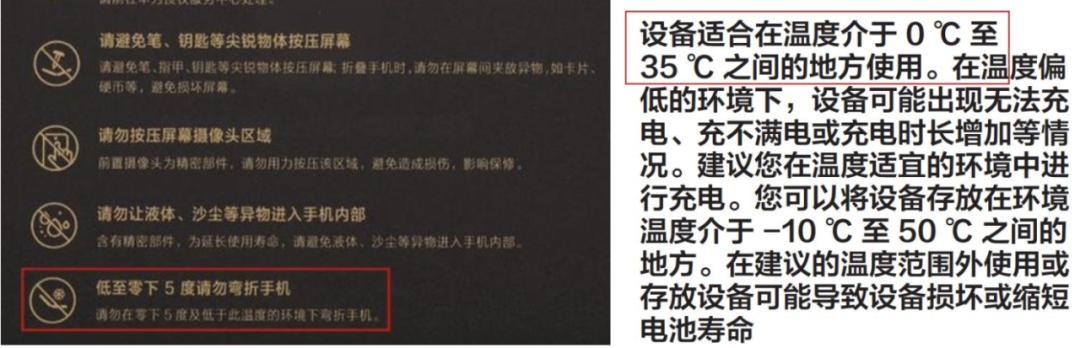 說明書和宣傳之間的差異,可能是考慮到了整機各個部件,也可能是廠家的穩妥之舉:理論上是沒問題,但不建議你冒險,更不建議你經常在低溫下摺疊。畢竟溫度越低,折壞屏幕概率越大。