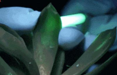 這些怪東西是一項來自華南農業大學的科研成果[4]。研究者把微米級粒徑的無機發光材料做成懸浮液,然後將它注射到了多肉植物的葉片中。結果,這些發光顆粒均勻地分佈到了多肉葉片的細胞間隙當中,發光效果竟然相當不錯。