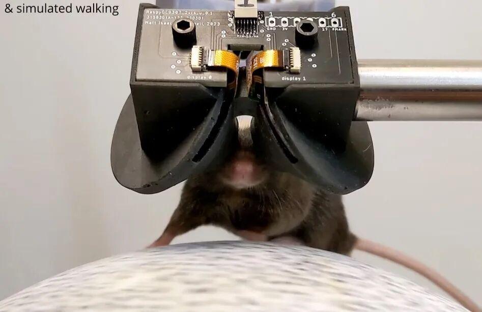 2025年,VR設備的風已經吹到了齧齒動物界。來自康奈爾大學的研究者爲實驗小鼠量身定製了一副專用的VR眼鏡,下面就是老鼠戴VR眼鏡感受虛擬現實的樣子: