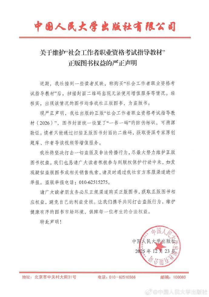 詳情:12月23日,中國人民大學出版社發佈關於維護“社會工作者職業資格考試指導教材”正版圖書權益的嚴正聲明,聲明如下: