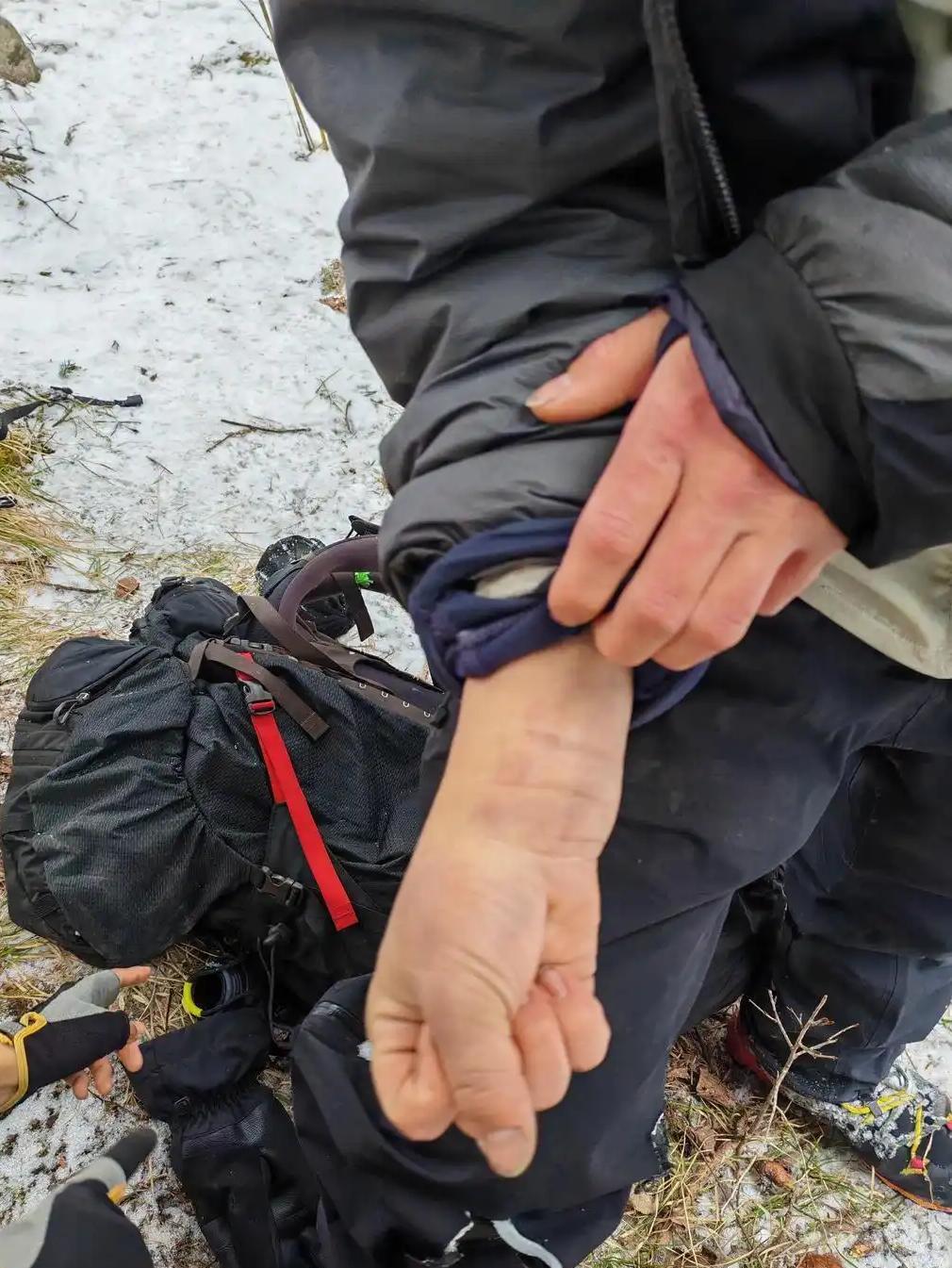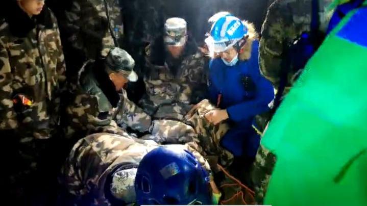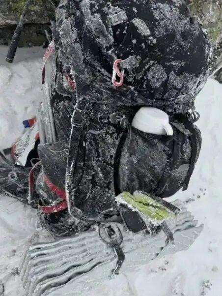 2月8日,孫某獨自進入禁區鰲太線,風雪中於12日從山坡滾下骨折,艱難求生(上圖),17日被搜救隊(下圖)找到 | 倖存者孫某/紅星新聞