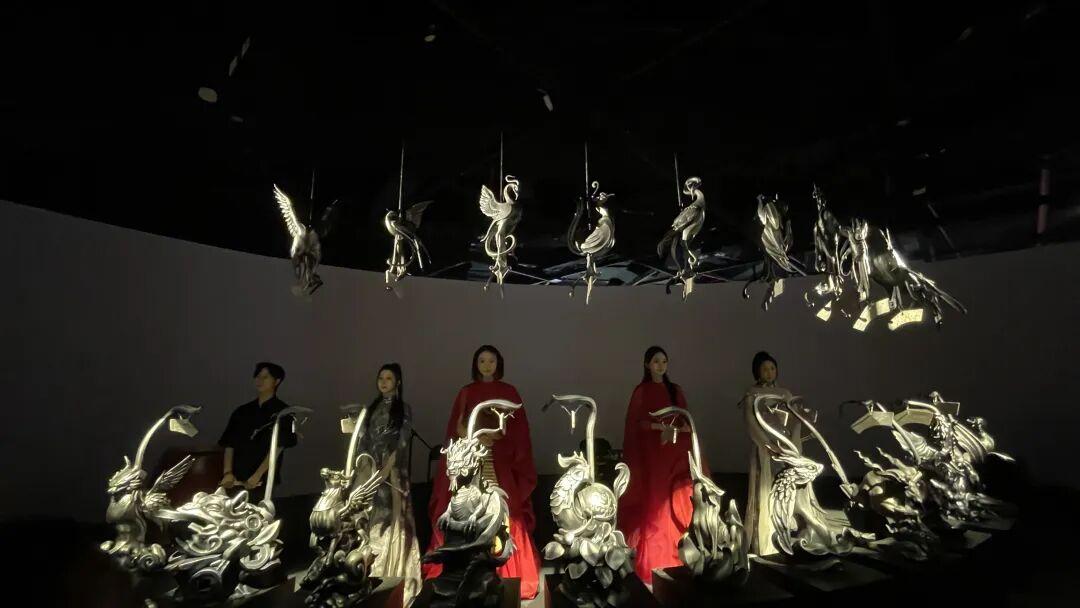 現在,在上海天文館“大器星成”的特展現場,你可以看見這組耗時五年最終制作成功的隕鐵編磬。20片磬片架設在20個原創設計的主要以《山海經》上古神獸身上,以四季、七政、九天的陣型排布。演奏時不需人工,神獸雕塑內部嵌入的機器人部件會按照編寫好的程度依次敲擊磬片。這是真正的天籟之音,是地外物質被人類文明塑造後發出的嗡鳴。因此,這套編磬的名字,叫作“萬籟寂”。