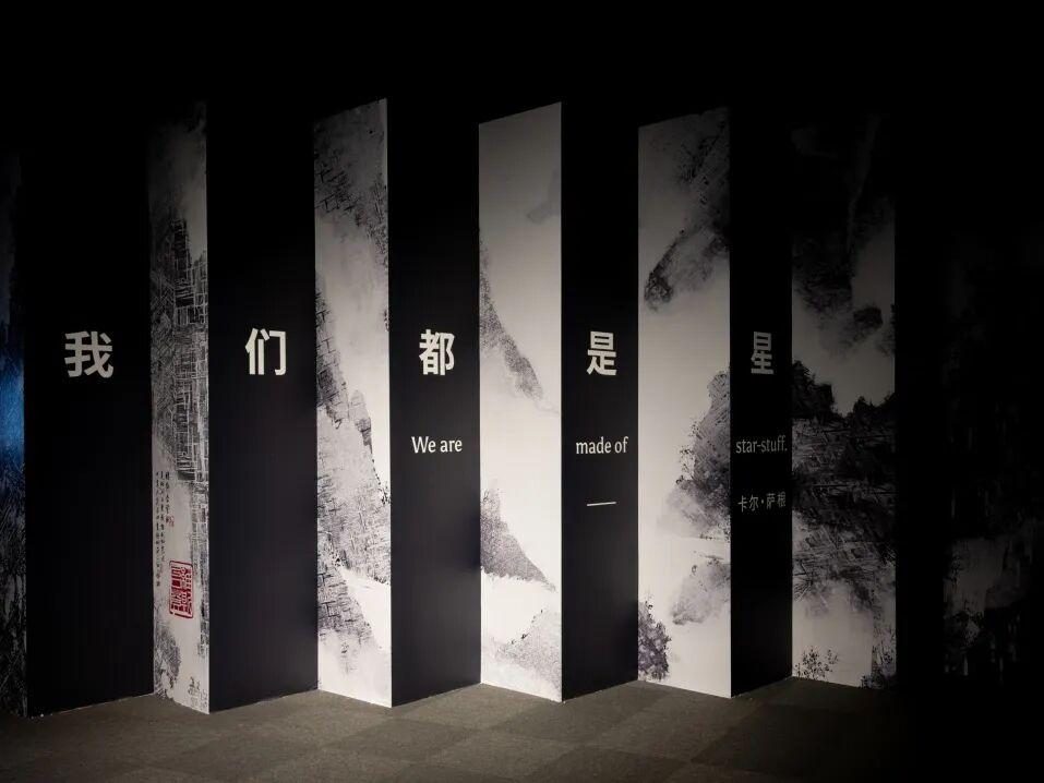 “除去‘萬籟寂’,我個人最喜歡的一件展品是維斯臺登紋拼接的中國山水畫摺疊牆。”上海科技館天文研究中心隕石研究室主任杜芝茂介紹到:“這個展品正面是山水畫,看完了轉過來,背面是卡爾薩根的名言‘我們都是星塵’。大家走到這個位置看完後,認知會上升到哲學的高度。”