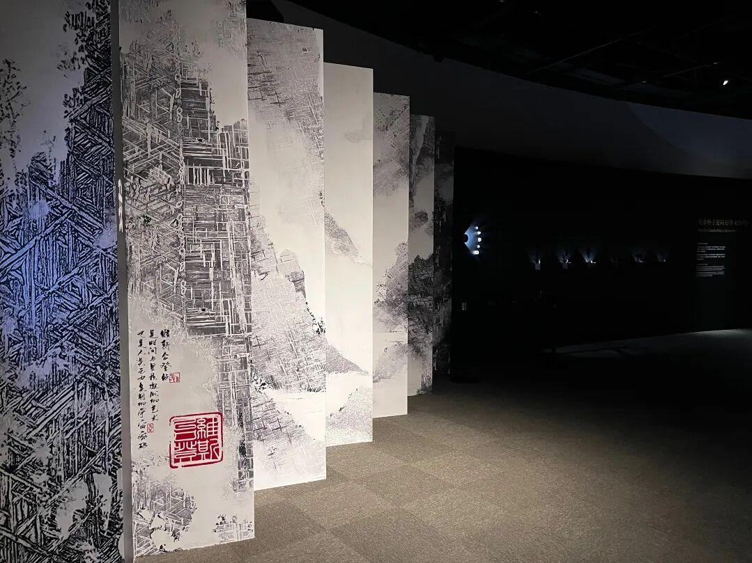 這面隕鐵紋路山水畫摺疊牆,正是果殼設計總監白雲飛的創意。事實上,這是他蒐集了10種不同形態類型的維斯臺登紋之後,親手設計拼接製作而成。觀衆可以親手撫摸這面牆,用指尖感受上面源自隕石肌理的凹凸起伏,更直觀也更鮮活地認知這來自天外的紋路。