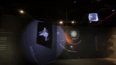 展館內另外一件別具巧思的展品,來自央美實驗藝術與科技藝術學院李博老師之手。一望之下,這似乎只是一片形狀有點奇怪的玻璃片,懸掛在射燈的光圈裏,不斷地來回旋轉。觀察它對面的投影牆,我們會驚喜地發現,有一個由光影構成的袖珍太陽系,正不斷在凝聚成形和化爲星雲之中輪迴——這是早期太陽系的演化過程,也是隕石和地球形成時的遙遠印象。