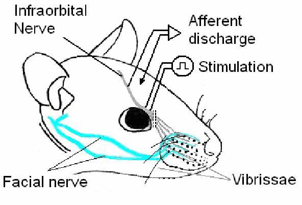 某個研究中對生物放電的記錄標誌,可以看出觸覺須(vibrissae)下的黑點爲毛囊,連接着面部神經(facial nerve)和眶下神經(infraorbital nerve)|Albarracín, Ana L. et al. (2007).
