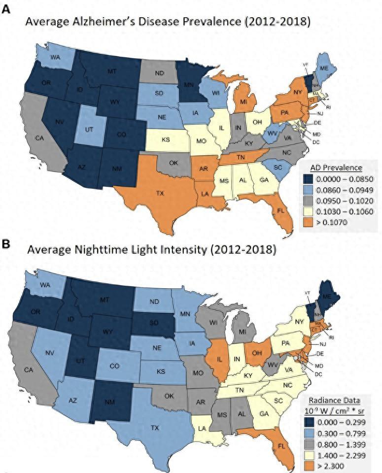 這項研究的科研人員把美國 48 個州的光污染情況和本地區的醫療記錄進行了比對,令人驚訝的是,他們竟然發現光污染和阿爾茲海默症之間存在顯著正相關,這種巧合也引起了科研人員的興趣。
