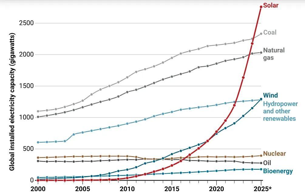 好在,以光伏發電爲代表的可再生能源正在蓬勃發展。根據全球能源智庫Ember的統計數據,在2025年可再生能源在全球範圍內的發電量已經超過了煤炭。能源格局的變化爲可持續發展帶來了新的希望,這是環境領域難得的好消息。