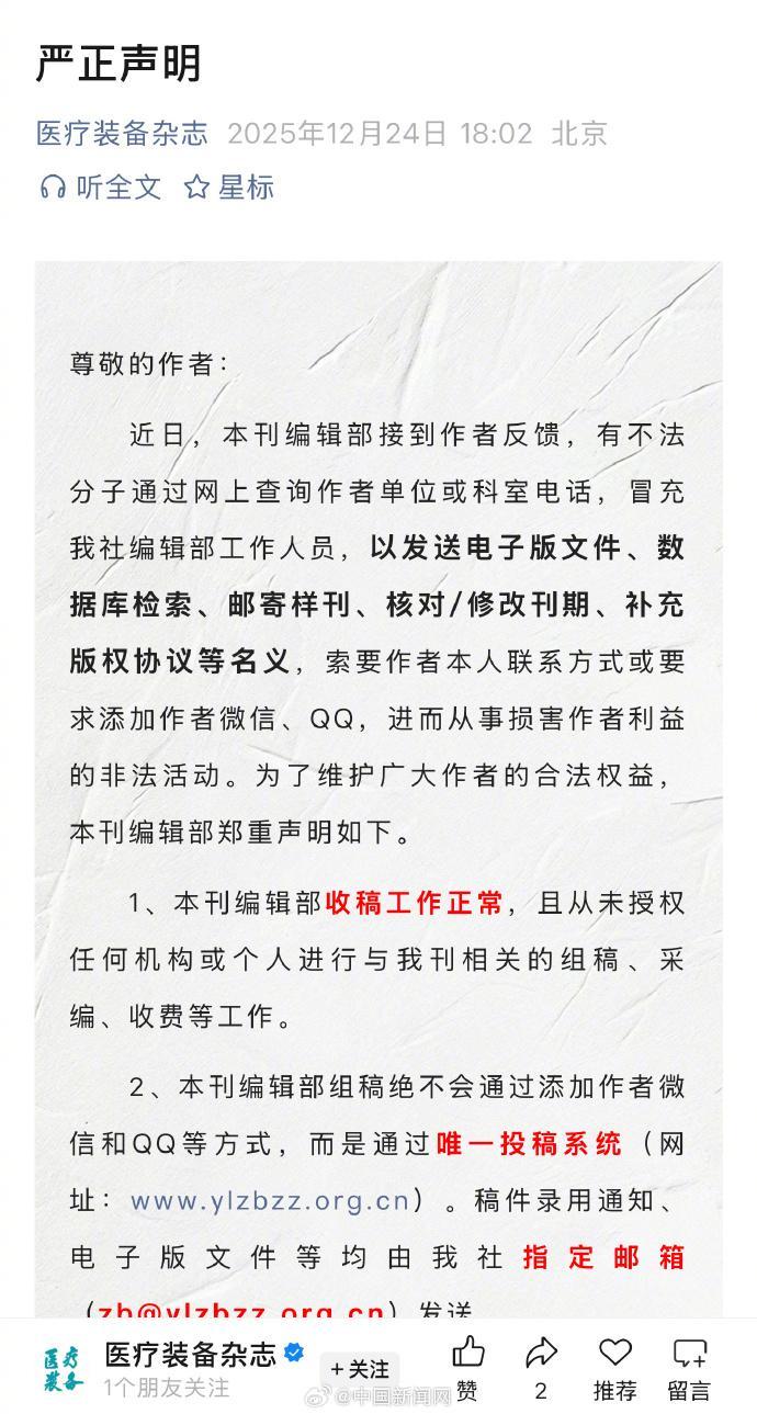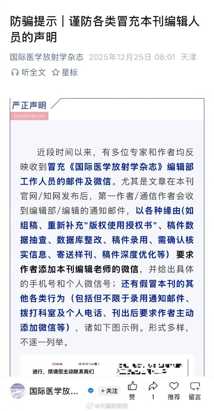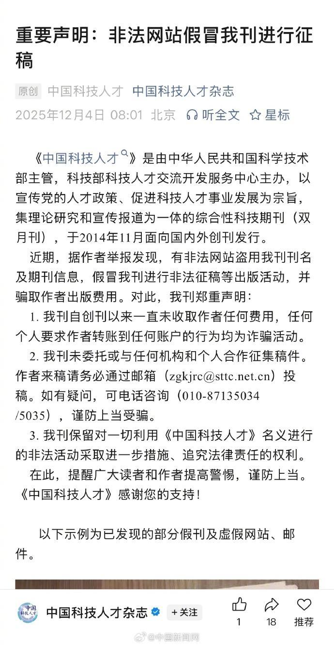 詳情:記者注意到,近段時間,多家國內學術期刊編輯部發布關於防範投稿、審稿詐騙的聲明。一些期刊稱發現有仿冒網站冒用其名義徵稿並藉機謀利。也有期刊聲明稱,有不法分子冒充該刊編輯,以“快速發表”“保證錄用”“文章數據複覈抽查”等名義從事詐騙活動,提醒讀者和投稿人注意甄別,並提供了官方舉報渠道。