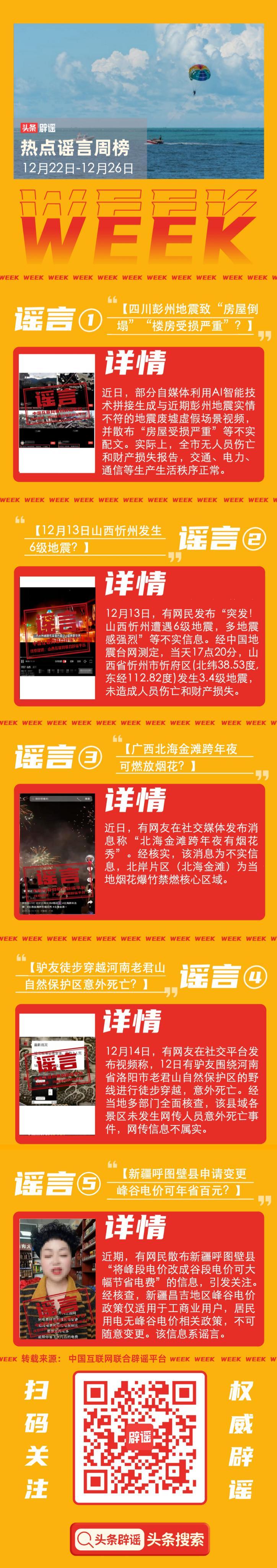 此外,本週還有“驢友徒步穿越河南老君山自然保護區意外死亡”、“新疆呼圖壁縣申請變更峯谷電價可年省百元”等不實消息流傳。