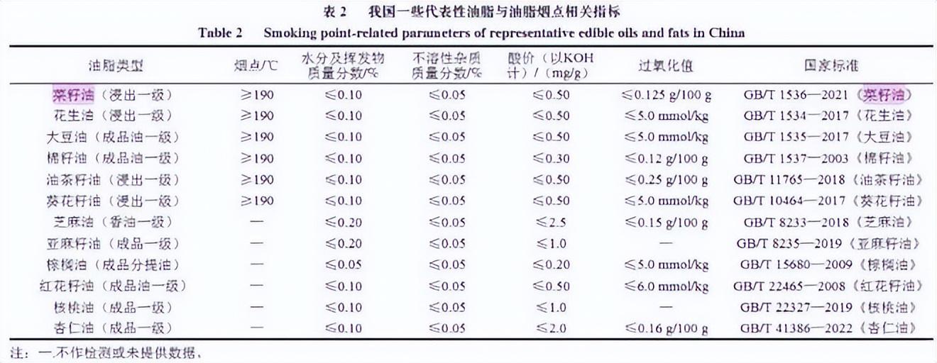 菜籽油煙點範圍通常爲 151~218.5℃,[6]在我國現行食用油國家標準中,菜籽油、花生油、大豆油等食用油脂一級油的煙點均統一確定爲“≥190℃”。菜籽油能夠輕鬆勝任煎、炸、爆炒等各種高溫烹飪方式,是名副其實的適合中國廚房的油。