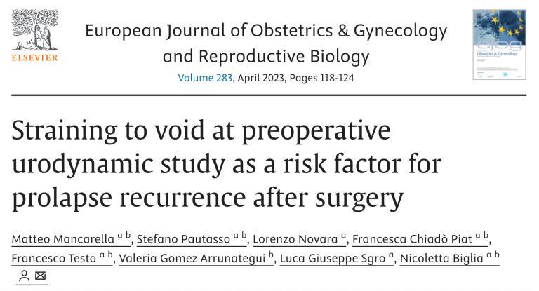 [4] Matteo Mancarella, Stefano Pautasso, Lorenzo Novara a, Francesca Chiadò Piat, Francesco Testa, Valeria Gomez Arrunategui, Luca Giuseppe Sgro, Nicoletta Biglia. Straining to void at preoperative urodynamic study as a risk factor for prolapse recurrence after surgery[J]. European Journal of Obstetrics & Gynecology and Reproductive Biology Volume 283, April 2023, Pages 118-124.