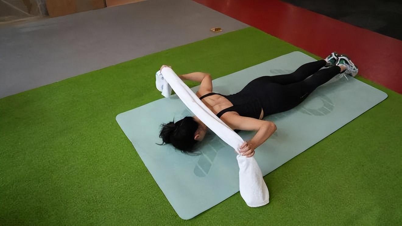 動作要領:平整的地面鋪上瑜伽墊,俯臥於瑜伽墊上,腹部貼地,頭、四肢向上抬起,雙手握住毛巾兩頭,雙臂前伸至與身體呈 Y 字,同時保持雙肩放鬆,夾緊雙肘。後縮手臂至與身體呈 W 字,感受中背部肌肉發力,以及背部中間的擠壓感。手臂前伸時吸氣,後縮時呼氣。