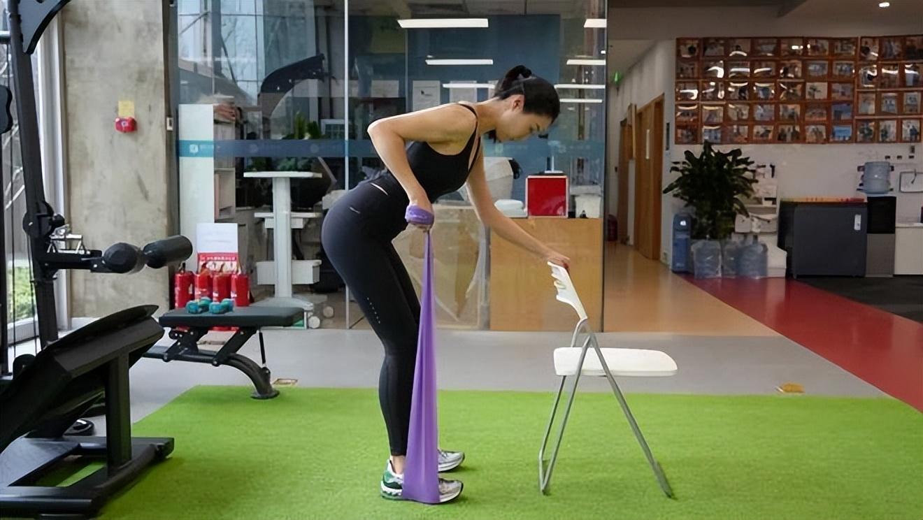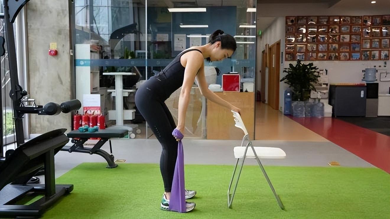 動作要領:用雙腳把阻力帶的一端固定在地板上,另一端握在手中。臂略微彎曲,軀幹向前彎曲,同時用一隻手扶住椅子。握住阻力帶的手臂自然垂下,開始呼氣,用力將阻力帶推向身體,吸氣並恢復到起始姿勢。