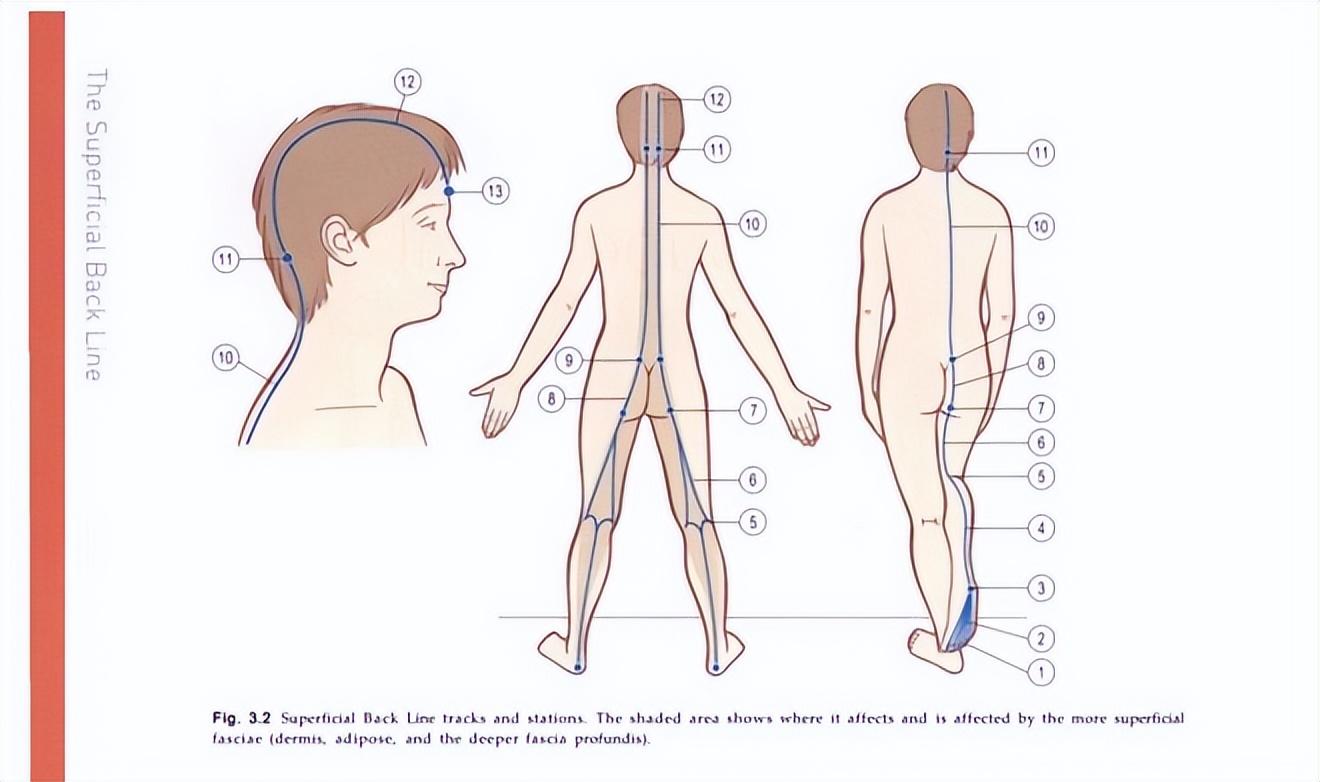 人體有 12 條筋膜鏈,分別是後表線、前表線、體側線、螺旋線、手臂線(淺背臂線、深背臂線、淺前臂線、深前臂線)、功能線(前功能線和背功能線)、前深線,其中後表線連接並保護整個身體的後表面,像一個從腳底到頭頂的盔甲,可分爲腳趾到膝蓋,以及膝蓋到額頭兩部分。