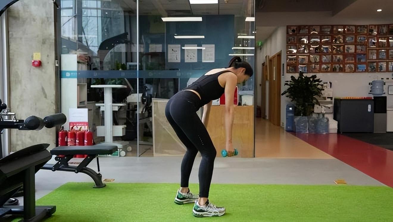 將兩個啞鈴拉到腰部位置,肘部不要伸向兩側。俯身並將啞鈴拉到腰部的同時,雙肘沿着身體的線條向後拉向軀幹。雙腿距離要比肩寬窄一些,這樣臀部就不會干擾到動作或接觸到啞鈴。
