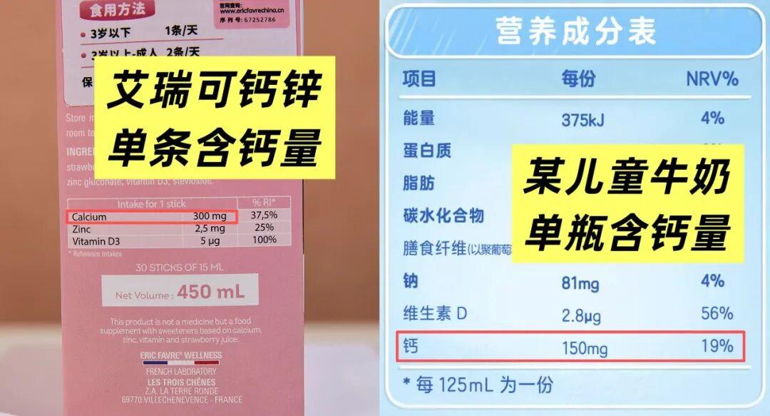 對比了市面一款號稱高鈣的兒童牛奶,這個1條含鈣量=2瓶兒童牛奶。