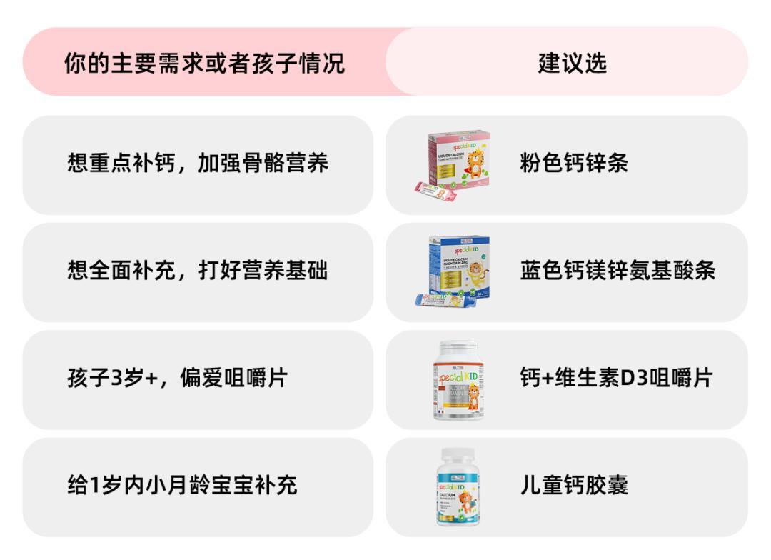 這次帶來的有:粉色鈣鋅條、藍色鈣鎂鋅氨基酸條、鈣膠囊、鈣+維生素D3咀嚼片、DHA藻油,滿足大家的不同需求。可以直接按表格需求選
