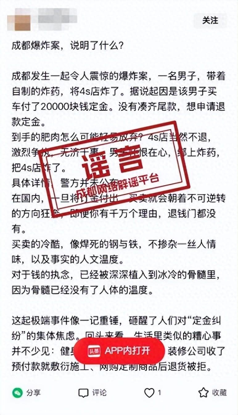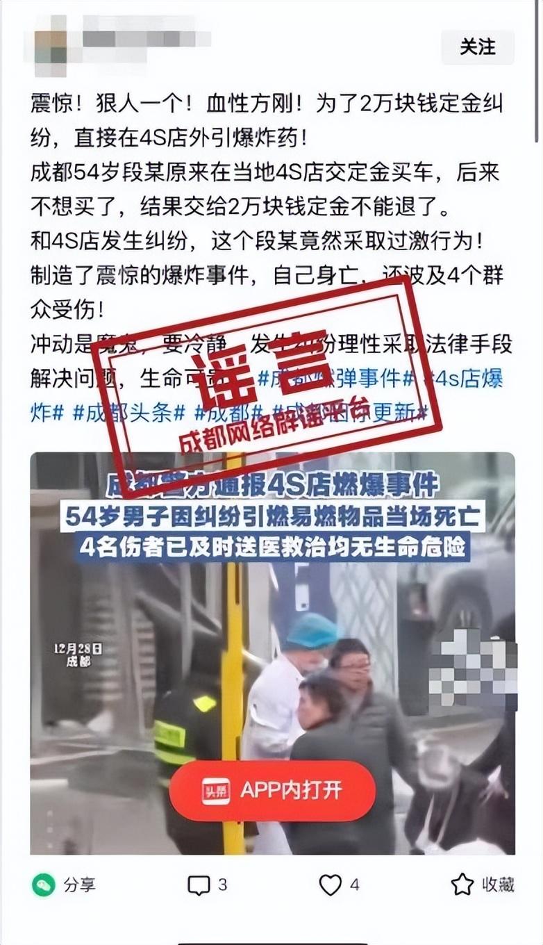 12月28日下午,成都市高新區南三環路四段一汽車銷售服務店鋪外發生燃爆事件。經警方初步調查,段某(男,54歲,本市人)因與店鋪存在糾紛,在店門外引燃易燃物品,造成其本人當場死亡、現場4人受傷。事件發生後,個別網民傳播“客戶是在礦山上班的能接觸到炸藥”“消費者未湊齊全款,4S店拒不退還定金”等信息引發網絡關注。