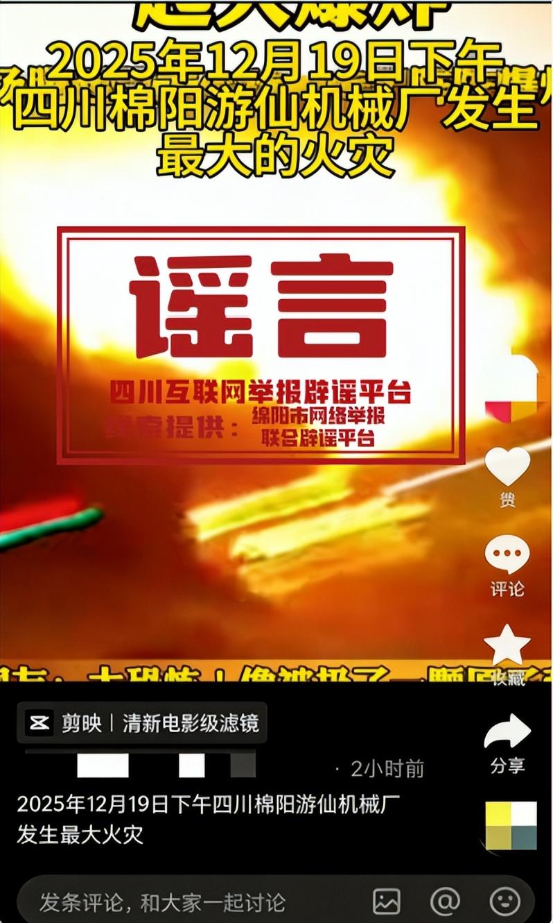 四川綿陽遊仙區一機械廠發生火災?假的!——熊貓斬謠(2025年12月29日)