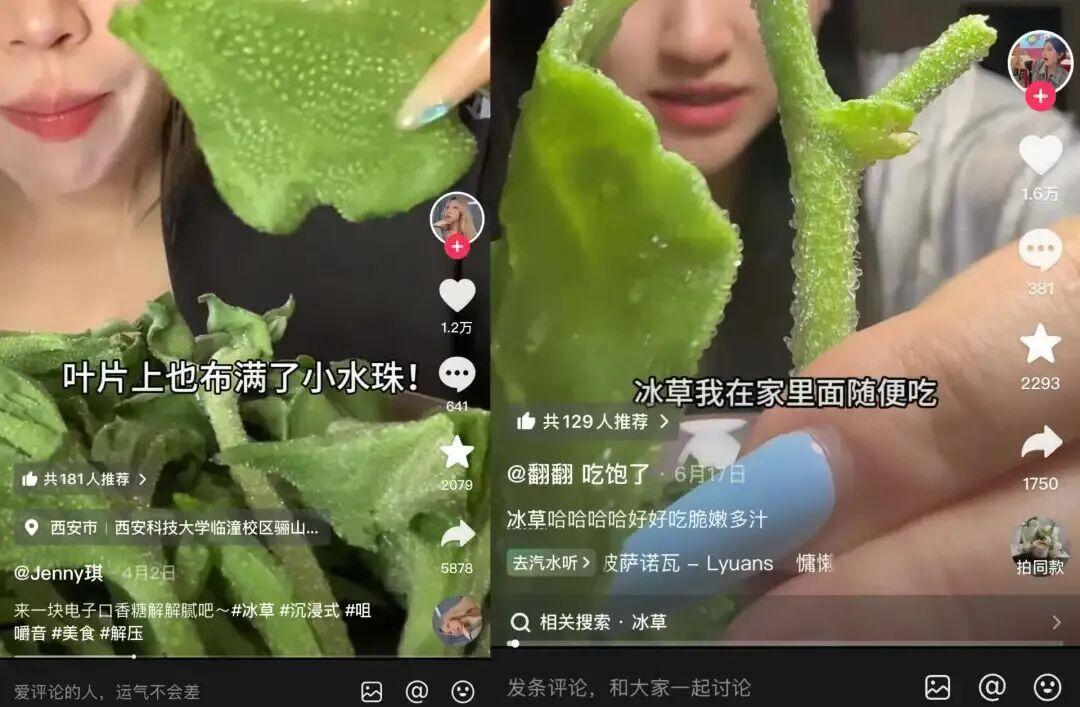 冰草的莖和葉質地堅實飽滿,咬下去會發出清脆的響聲。由於冰草佈滿了鹽囊泡,咀嚼時還會有爆汁的感覺。社交平臺上,還有網友專門錄製了沉浸式喫冰草的視頻,相關視頻動輒收穫上萬點贊,網友直呼聲音超解壓,完全成了冰草的聲控。