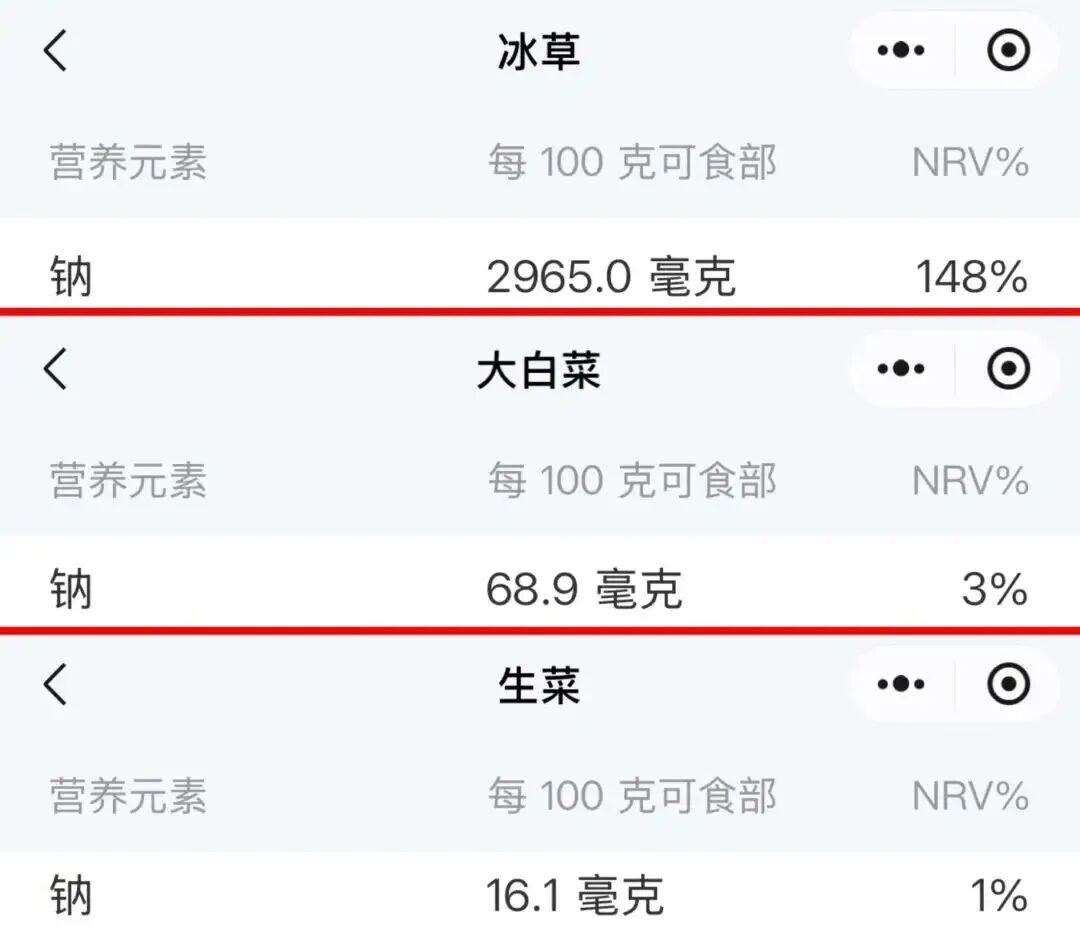 根據薄荷健康數據,冰草每100克可食部分鈉含量高達2965毫克,NRV%(各營養素含量佔營養素參考值的百分比)達148%。這意味着喫100克冰草攝入的鈉,已經超出了世界衛生組織推薦的成人每日2000毫克鈉攝入限量,並且能滿足成年人一天鈉推薦攝入量的148%,妥妥的過量了。