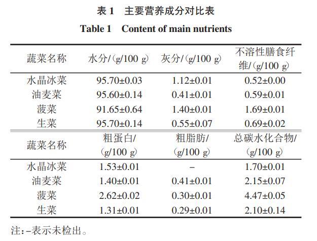 首先冰草的水分含量很高,達95.7%,同時蛋白質含量也相對較高,高於生菜和油麥菜,而粗脂肪含量較低,這表明冰草是一種補水、高蛋白又低脂的蔬菜。