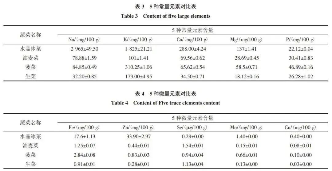 就礦物質元素來說,冰草除Se和P含量低於對照的幾種蔬菜外,其他8種元素的含量遠超其他蔬菜。其中,Na含量是(2965±49.50)mg/100g、K含量是(1825± 21.21)mg/100g,含量極高。可見冰草是非常好的礦物質來源,可以作爲補充K、Na、Ca、Fe、Zn、Mg等元素的重要食物。