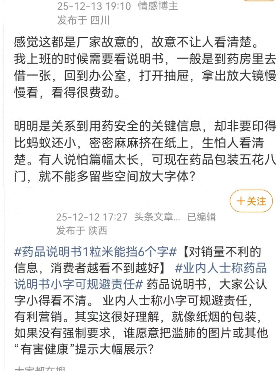 近期,“藥品說明書故意印小字隱瞞副作用”的說法在社交平臺引發熱議,不少網友吐槽“字小到需要放大鏡”,質疑廠家暗藏貓膩。