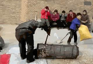 當“鐵葫蘆”加熱到一定程度的時候,他會把這個罐子放入一個套着膠皮的袋子裏,然後用一個扳手打開蓋子,一般是用腳踹,這時伴隨着驚天動地的“呯”一聲巨響,罐子裏的米花被嘣到袋子裏,圍觀的人都會虎軀一震。
