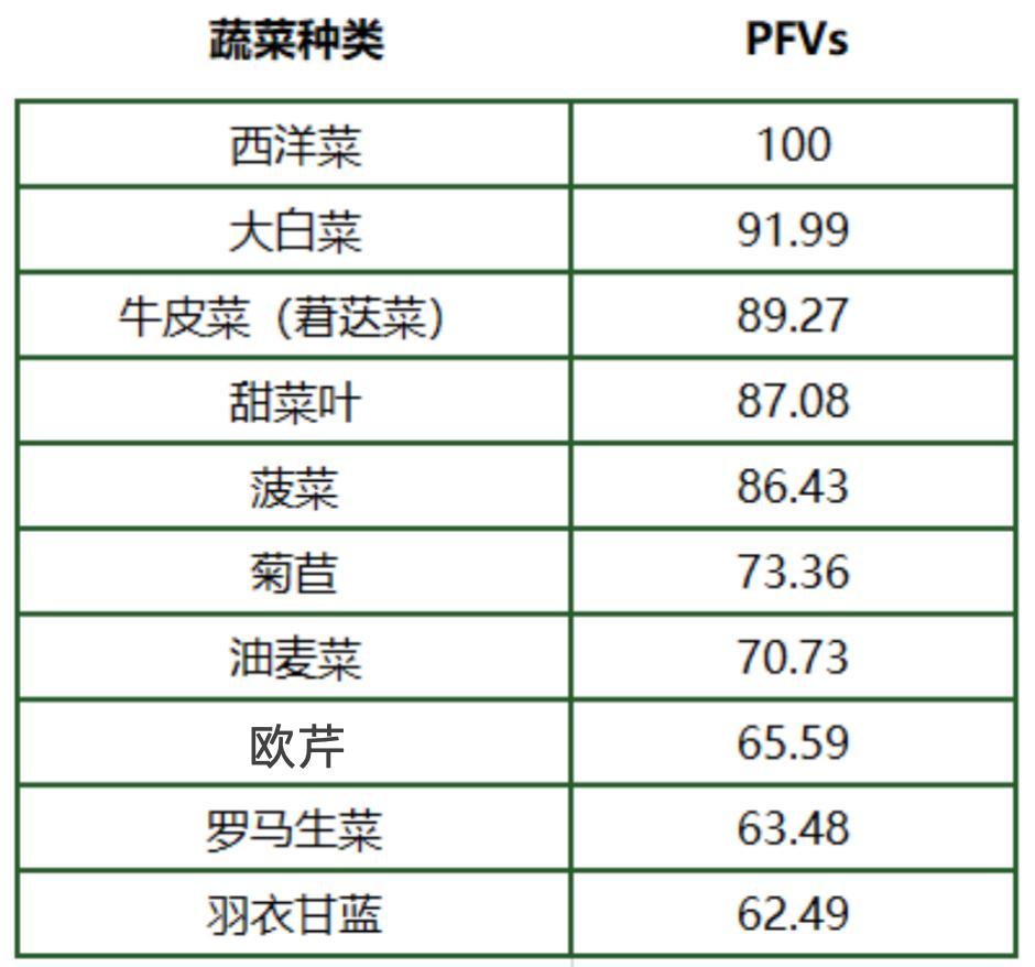 2014 年,美國疾病預防控制中心(CDC)做了一項長期評估,給蔬菜和水果的營養密度打分排名。“高活力/高效果蔬(PFVs)”,就是每 100 千卡能提供 17 種營養素,且每種營養素都達到人體每日所需量 10% 以上的蔬果。在這次排名裏,西洋菜得了滿分 100 分,排名第一。