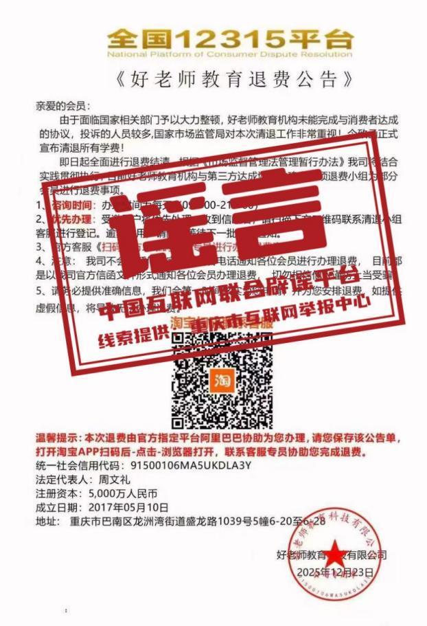 真相:近日,部分重慶市民收到“全國12315退費公告、清退會員費”的短信和圖片,聲稱某教育機構可辦理學費清退,引發關注。經重慶市巴南區市場監管局調查,市場監管部門未對公告中的企業進行所謂“清退”工作,也未發佈關於該企業的退費公告。該公告杜撰不存在的法律法規名稱,涉嫌冒充國家機關名義實施詐騙。巴南區市場監管局已向公安機關移交案件線索。