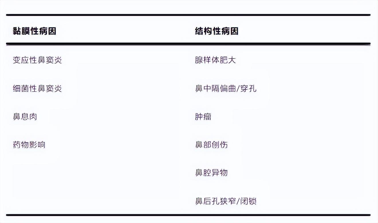 造成口呼吸的原因,可分爲黏膜性病因和結構性病因。黏膜性病因是因爲過敏、感染等原因導致鼻黏膜腫脹,進而引起鼻塞;而結構性病因,是因爲鼻腔結構異常,比如異常增大的腺樣體、腫瘤、異物等阻塞了鼻腔,先天性鼻畸形比如鼻中隔嚴重偏曲、鼻後孔閉鎖等導致鼻子不能正常通氣。