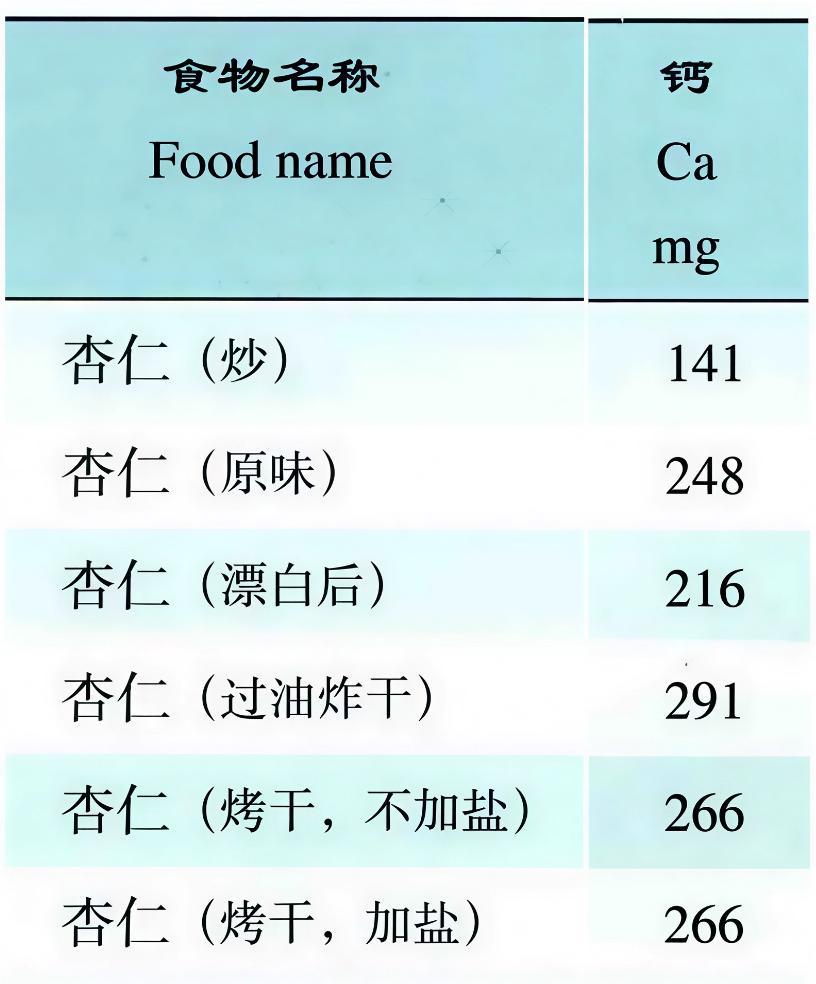 不同加工方式的杏仁鈣含量差異較大,每 100 克含量在 141~291 毫克不等,是牛奶(107mg/100g)的 1~3 倍。雖然吸收率不如牛奶,但勝在量大,爲不愛喝牛奶或乳糖不耐受的人羣提供了一個美味的補鈣新選擇。
