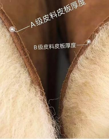 隆豐全球進口好品質的羊毛皮,爲了保證羊毛的保暖效果,只採用一歲以內羔羊皮的脊背部分,皮板厚度不低於1塊錢硬幣的厚度,這屬於靴用級標準皮料,也是國家羊剪絨行業標準的皮料!