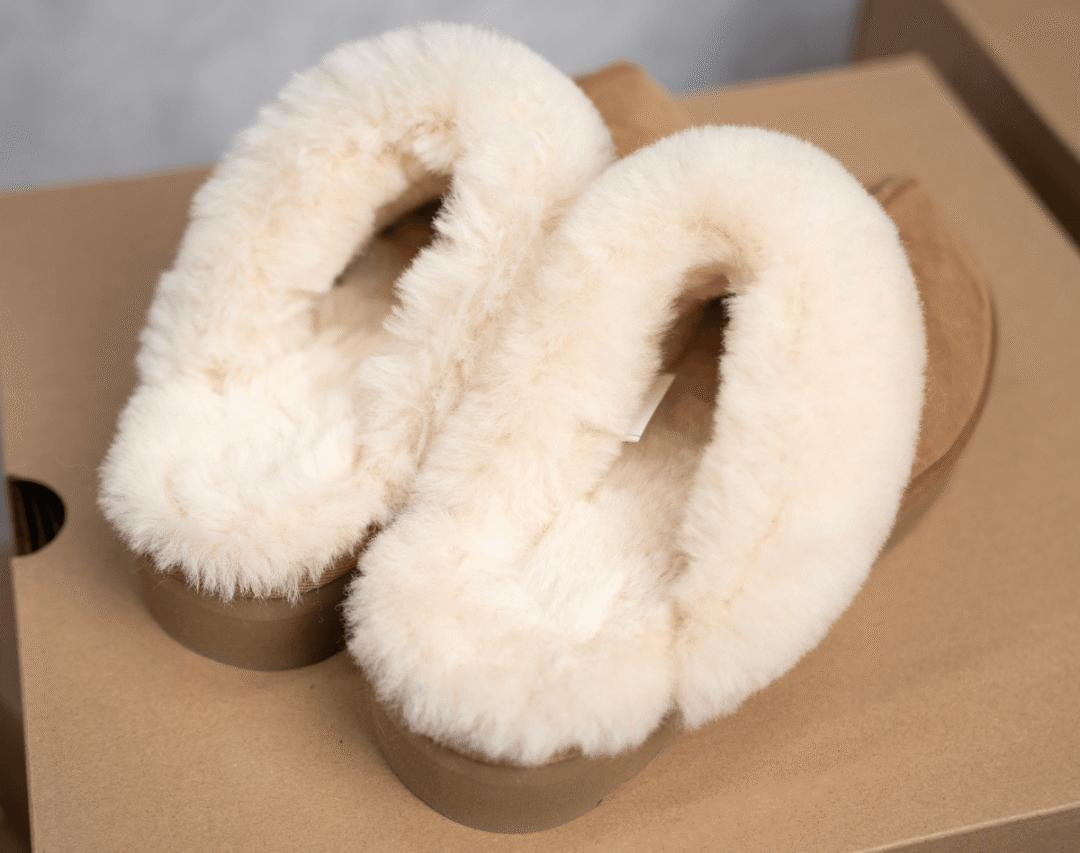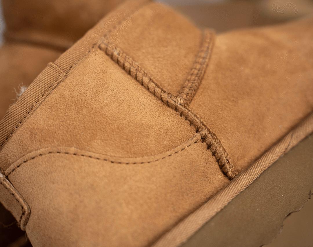 | 鞋剖面 | 天然皮毛一體沒分層 | 絨毛和鞋面是膠水、縫製在一起的 |