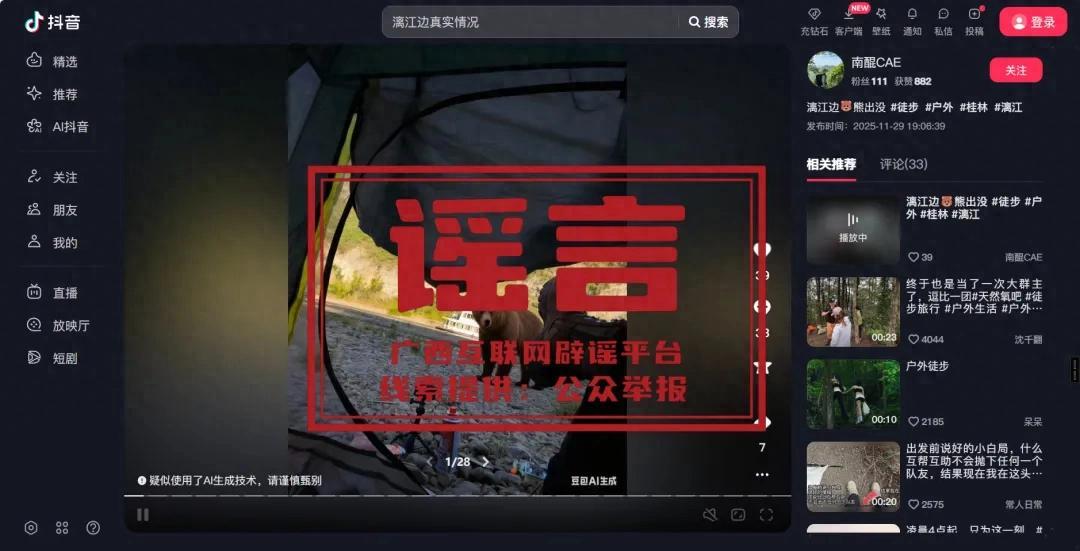 2025年12月8日,廣西桂林市公安局七星分局在網絡巡查工作中發現,網民曾某於11月29日晚,通過AI軟件生成一段“大黑熊出現在灕江邊”的虛假視頻,並將該視頻發佈至抖音平臺。