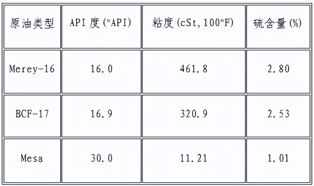 委內瑞拉出產的大多數原油屬於重質油或特重質原油。例如一份 2006 年的分析顯示,Merey16 原油 API 度爲 16.0°,37.8°C 下粘度高達 461.8cSt,硫含量約 2.80%;另一種 BCF17 原油 API 度 16.9°、硫 2.53%;較輕的 Mesa 原油 API30.0°、硫 1.01%[5]。可見委內瑞拉原油普遍密度大、硫含量高,屬於重質高硫類型。