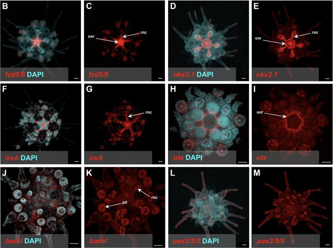 研究團隊發現,海膽的神經元遠不止集中在那個簡單的神經環中。事實上,海膽體內最豐富的細胞就是神經元。這些神經元分佈在海膽全身,多達數百種,而且同時表達着棘皮動物特有的“頭部”基因,以及在脊椎動物中樞神經系統中普遍存在的基因。這說明,海膽不僅全身都是神經,而且這些神經構成了一個類似大腦的整合系統。