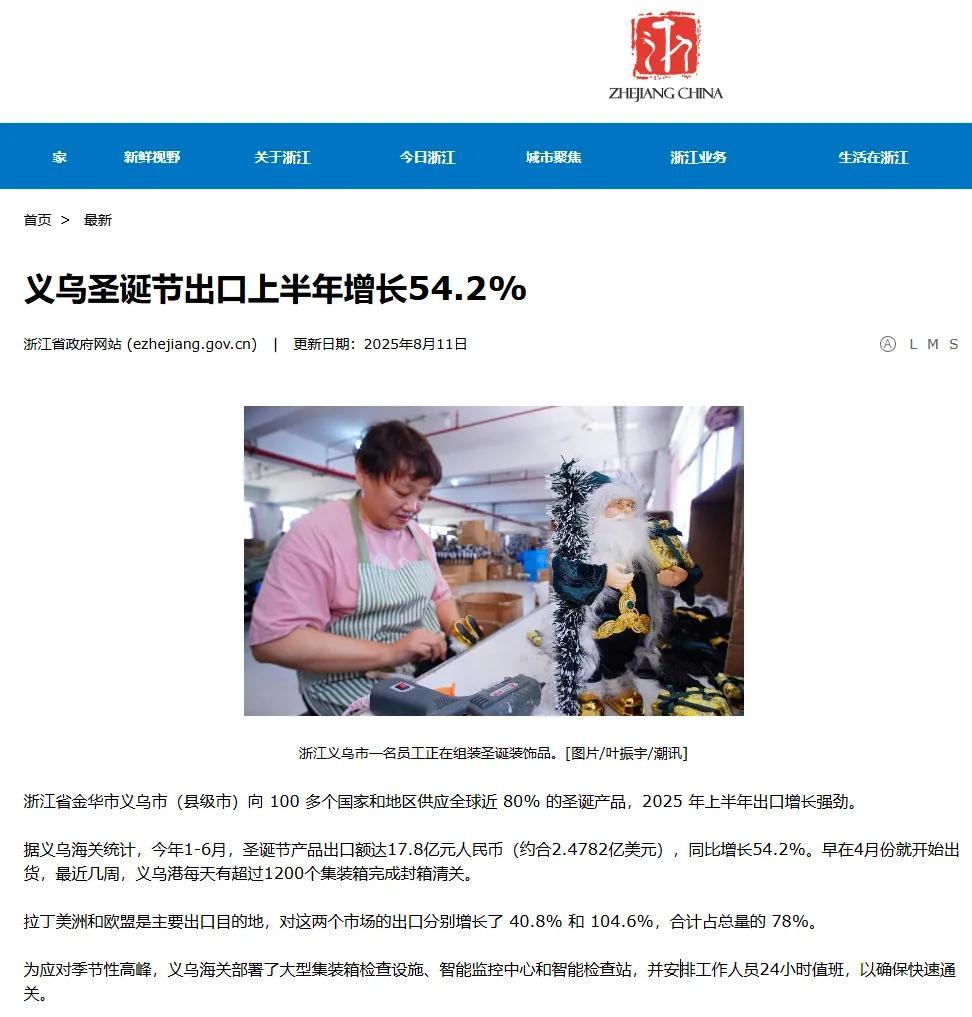 事實上,早在去年11月,《中國日報》就曾引述據行業統計數據,指出義烏作爲“聖誕老人第二故鄉”,是全球最大聖誕產品生產和分銷樞紐,負責全球聖誕季近80%的商品供應。
